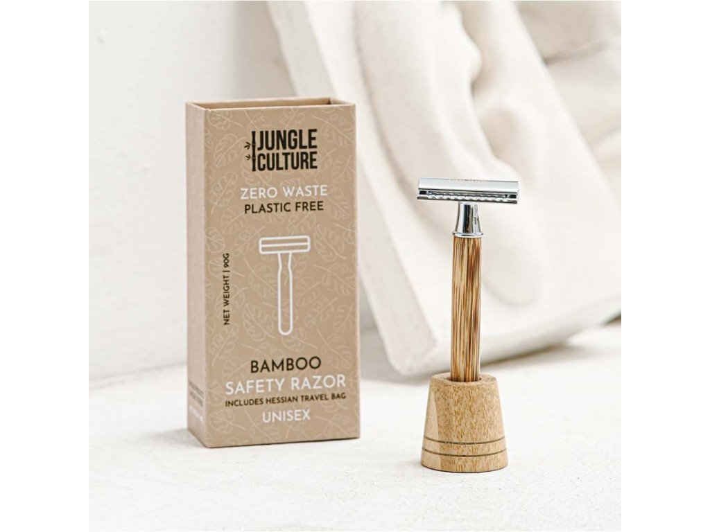 Elegantný holiaci strojček na klasické žiletky s bambusovou rukoväťou a stojanom z bambusu, ktorý udrží holiaci strojček v čistote. Unisex - perfektná alternatíva bez plastov pre mužov aj ženy.